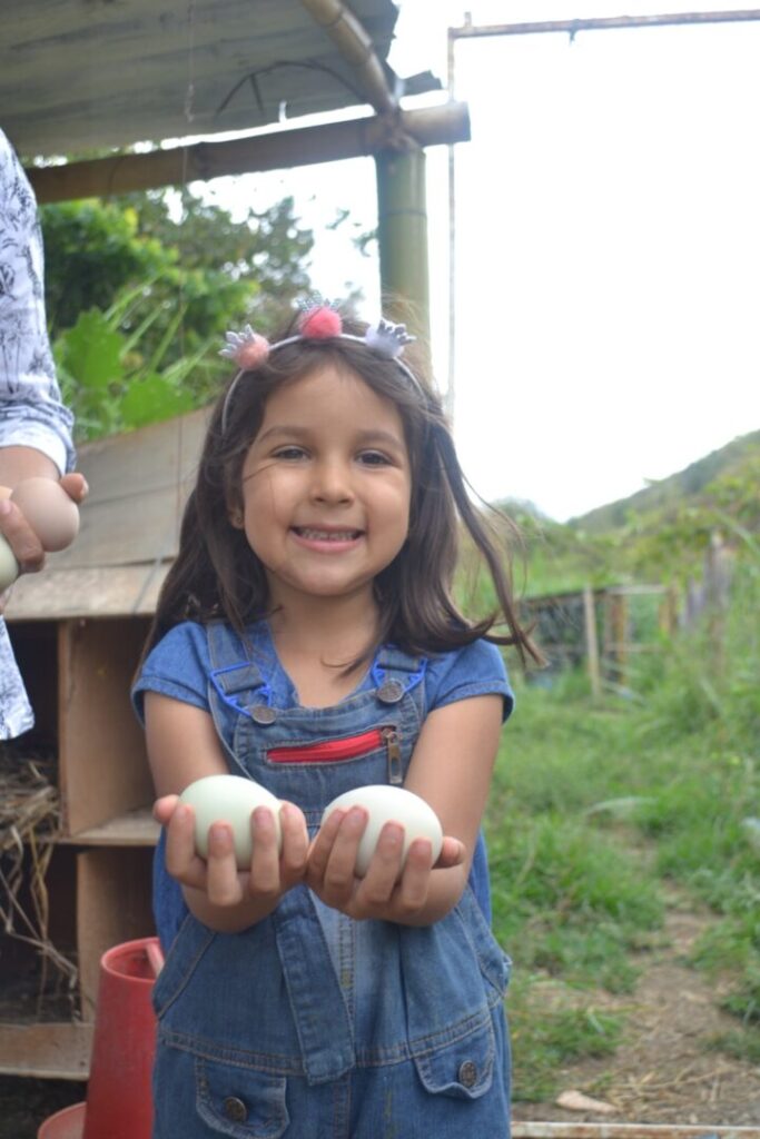 “Mi hija Juana Isabel como está pequeña, le encanta estar al lado mío, hacer todo lo que yo hago, me acompaña en la huerta, a visitar nuestras vecinas las gallinas y agradecerle por los huevos, revisar los detalles para que estén cómodas, es la que me trae el agua, la que tiene la herramienta pequeña, la que sabe de insectos”